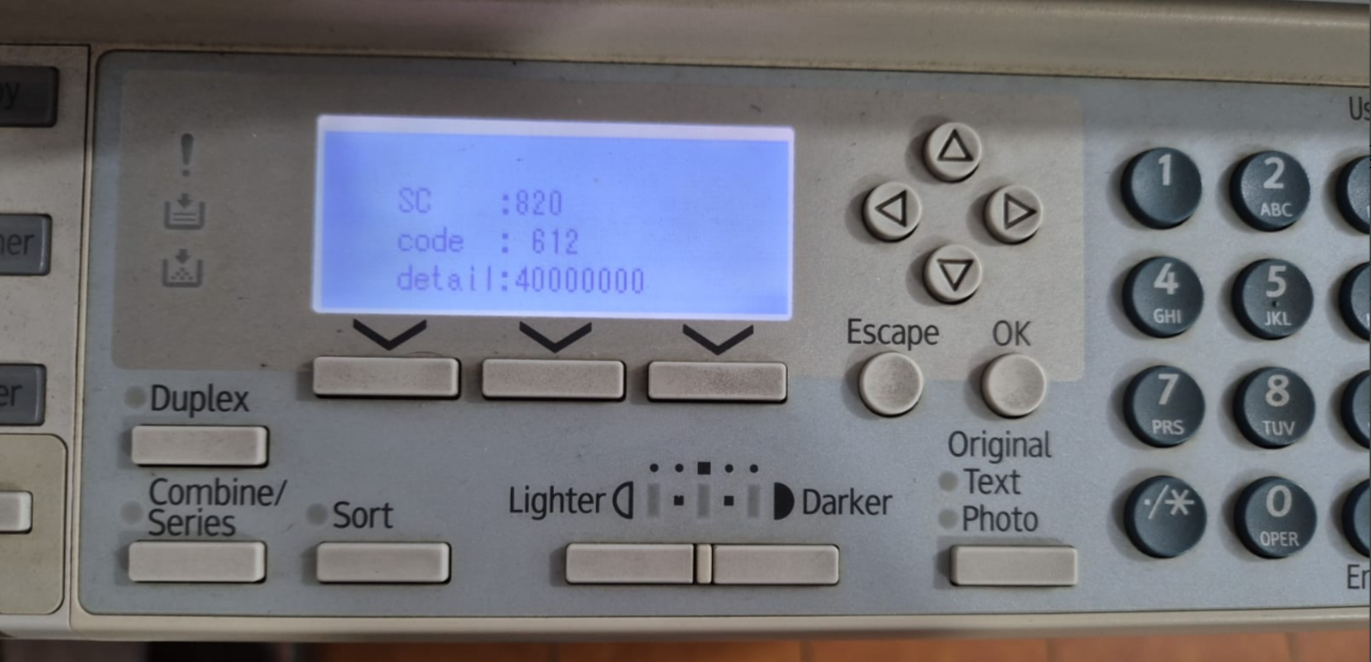 El error SC820 en la Ricoh Aficio MP-201 es un indicador de fallo serio del sistema de control: puede venir de la CPU, del firmware o de la placa de control.