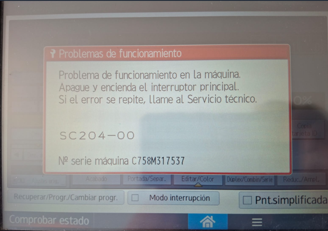El error SC204-00 es un fallo del motor poligonal del láser, muy crítico para la generación de imagen.