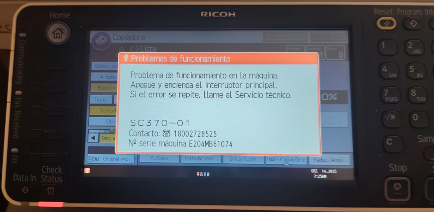 El código de error SC370-01 está relacionado con un TM (ID) Sensor Calibration Error, lo que significa que el sensor de densidad (ID Sensor) no puede ajustar su voltaje óptico dentro del rango permitido.