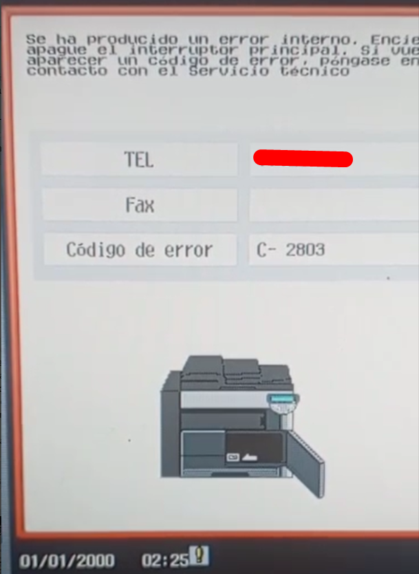 El error C-2803 es un código de protección por alto voltaje, activado cuando el sistema detecta valores anormales en el control de densidad de tóner.